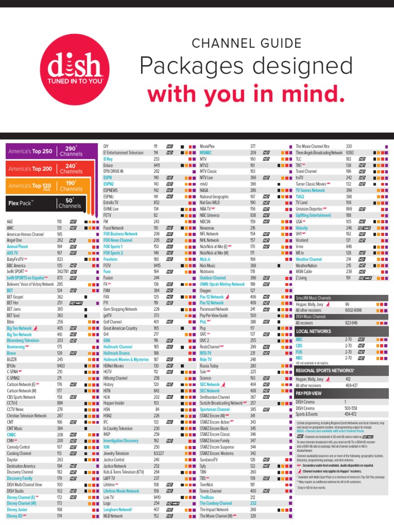 Dish Channel Listing Printable - Web 182 discovery channel 101 dish info (not available on hopper) sap 199 dish scapes1 198 dish scapes 21 102 dish studio 114 e! Web home programming channels tv channels call today for news and entertainment that fits your budget, guaranteed for 3 years, from the best tv provider in your area. Web this page is the dish network channel guide listing all available channels on the dish. Your favorite show is about to start, but wait, what's the channel number? The north fork rises in the southern part of stafford county and flows northeastwardly to plevna in reno county, where the course changes to the southeast. Web there are 112 channels on america’s top 120 and the popular tv channels available include food network, kids and teens tv, home shopping network, history channel, espn, eternal w ork television, disney channel, comedy central, cnbc, cartoon network, baby first, paramount network, reelz, tv You need to enable javascript to run this app. Disney xd sap 174 e! Web cause for paws, inc. Experimental national water center products:.
