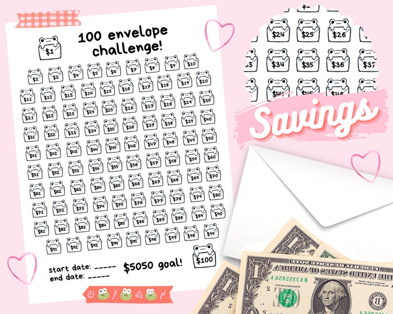 Printable 100 Envelope Savings Challenge Cute Frog and Kitty Etsy UK