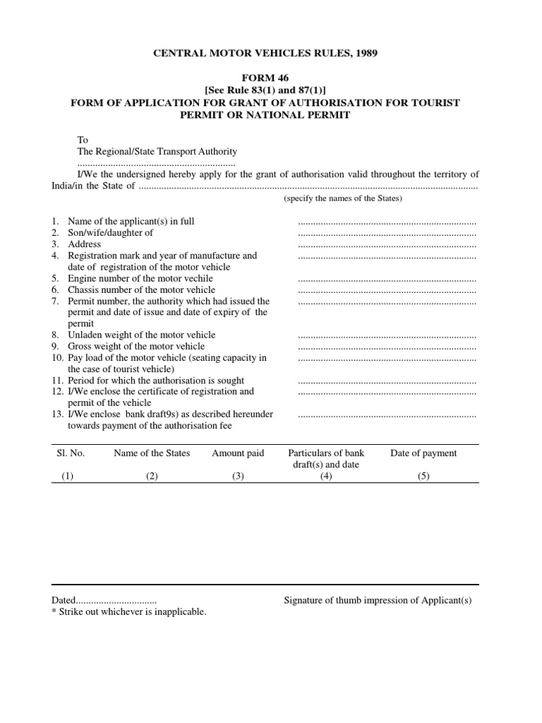 Form 46Application for Grant of Authorization for Tourist Permit or